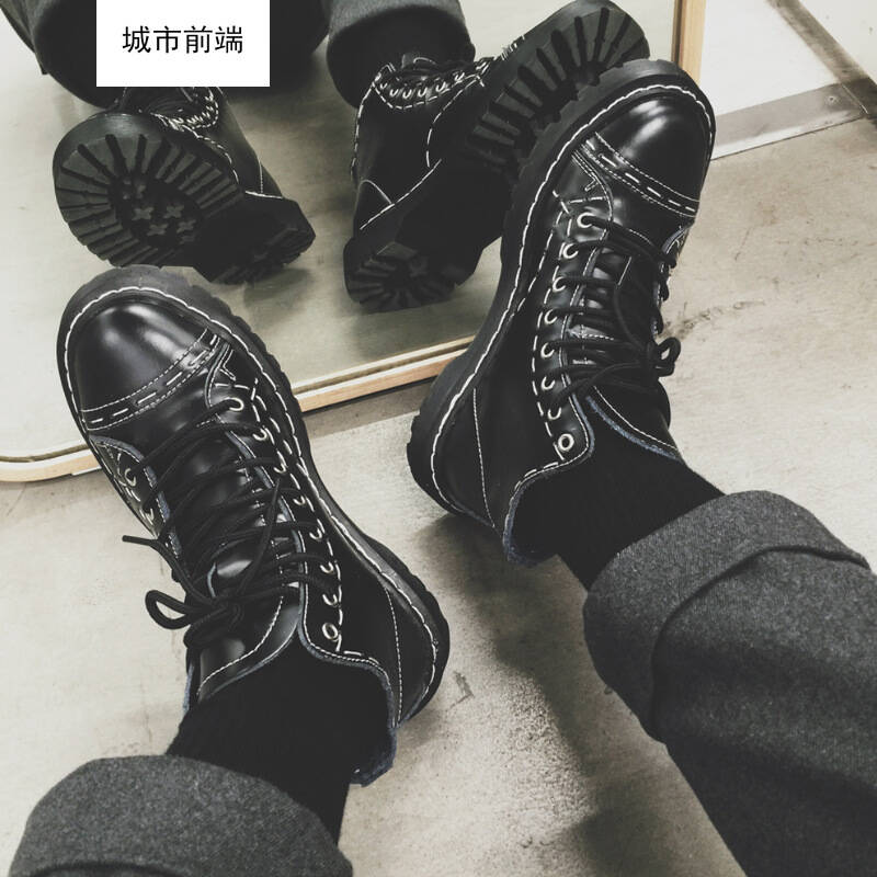 城市前端皮靴男士2017马丁靴高帮男鞋厚底油蜡皮休闲男靴 车缝线装饰防滑机车靴 黑色 39