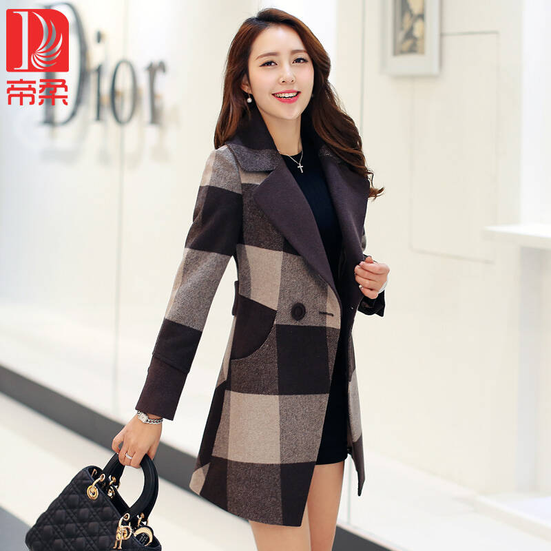 帝柔(DIROU)2016秋冬季新款女装呢子外套韩版格子毛呢大衣DD299 咖色格子 M