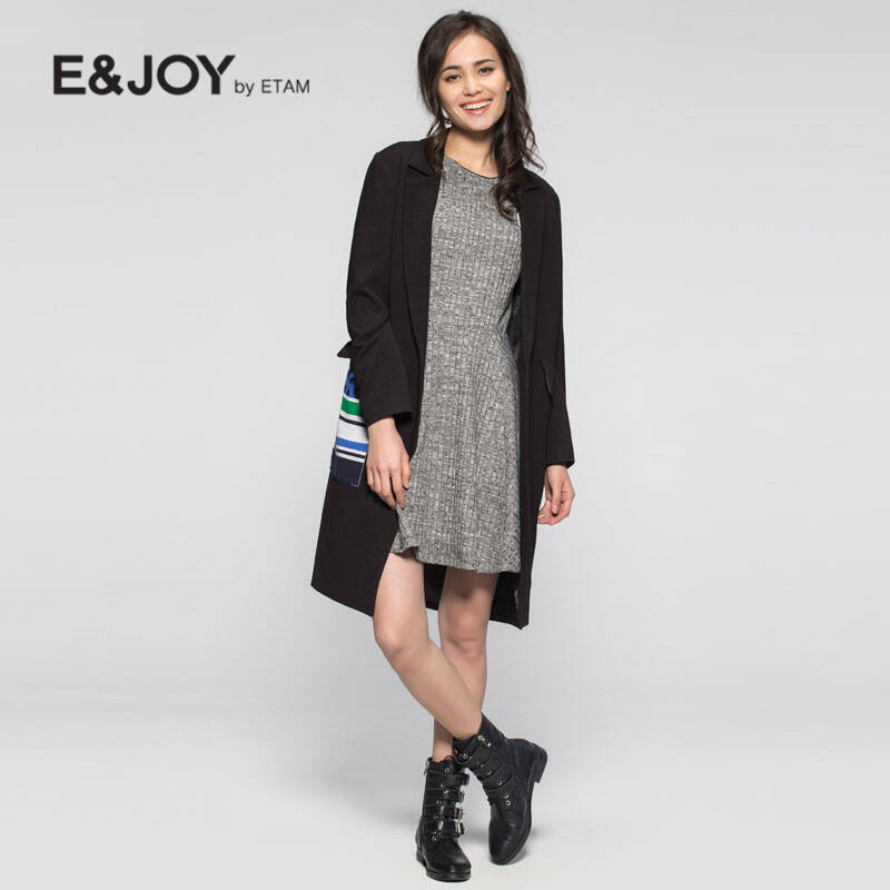 艾格 E&joy 2016春纯色拼接中长款大衣16083401295 黑色 38M