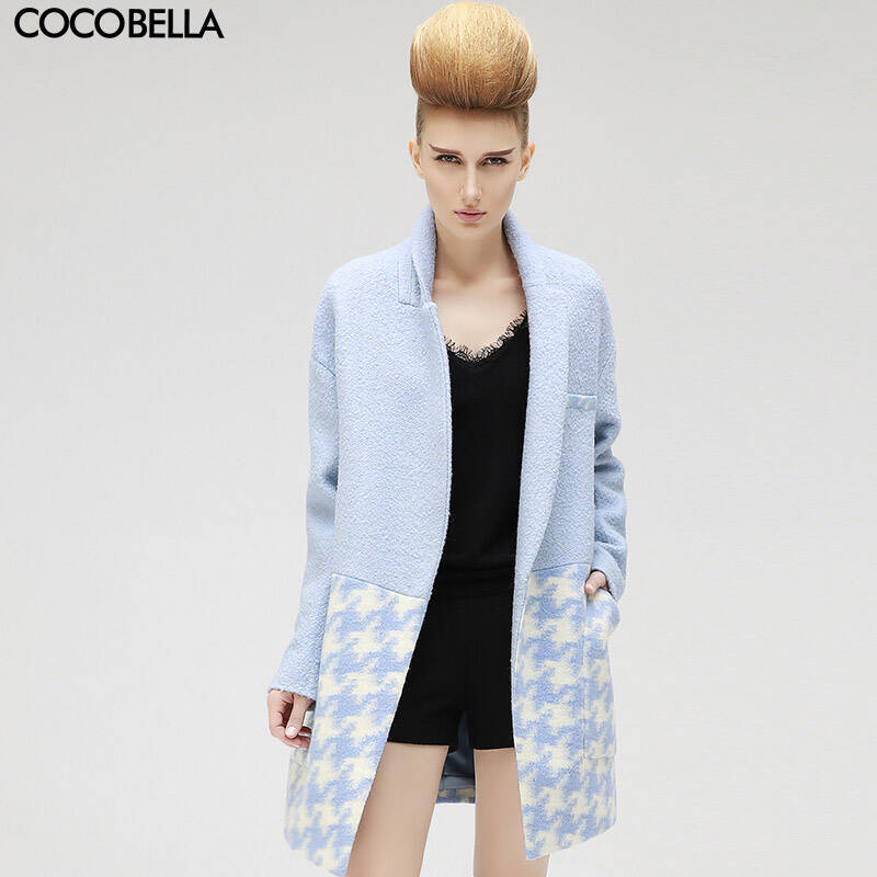 COCOBELLA 拼接千鸟格羊毛大衣女廓形毛呢外套CT538 婴儿蓝 M