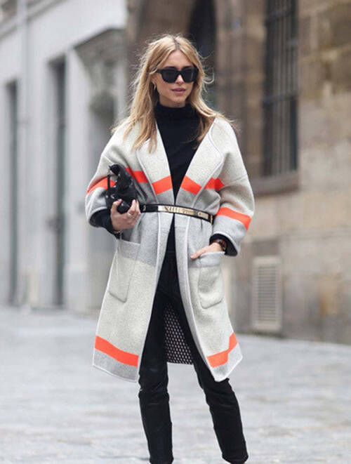 拼色毛呢大衣搭配一根金属腰带,凸显腰身又显得十分时尚。内搭都选用黑色,简约低调,不过分抢眼。
