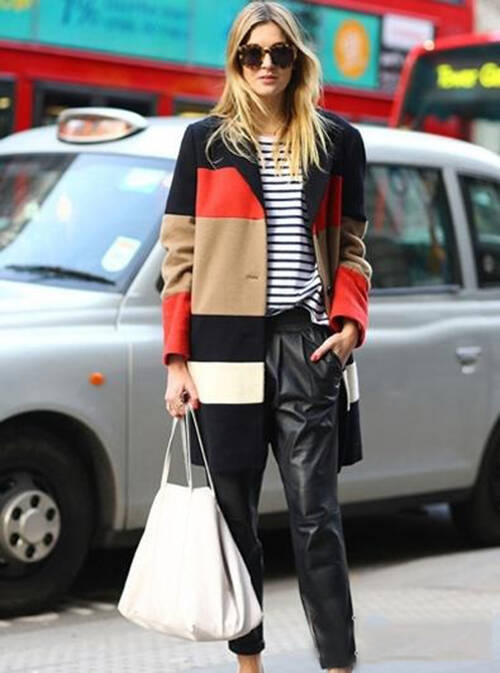 黑白条纹的打底衫搭配时尚帅气的皮裤,外搭一件黑白红驼色拼接的茧形大衣,拎上一只白色大包,拼接大衣极具时尚感,墨镜衬托出欧美的街拍范。