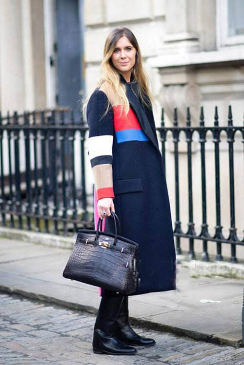 几何拼接的大衣尽显时尚气息,搭配铂金包,大衣又高贵,一双马靴则显得整个人帅气利落。