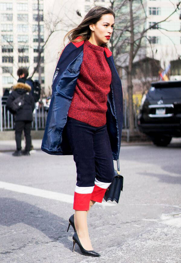 大面积的拼色可能对于有些人来说比较难驾驭,所以像这种在袖子处的小面积拼色点缀则更适合日常穿搭。