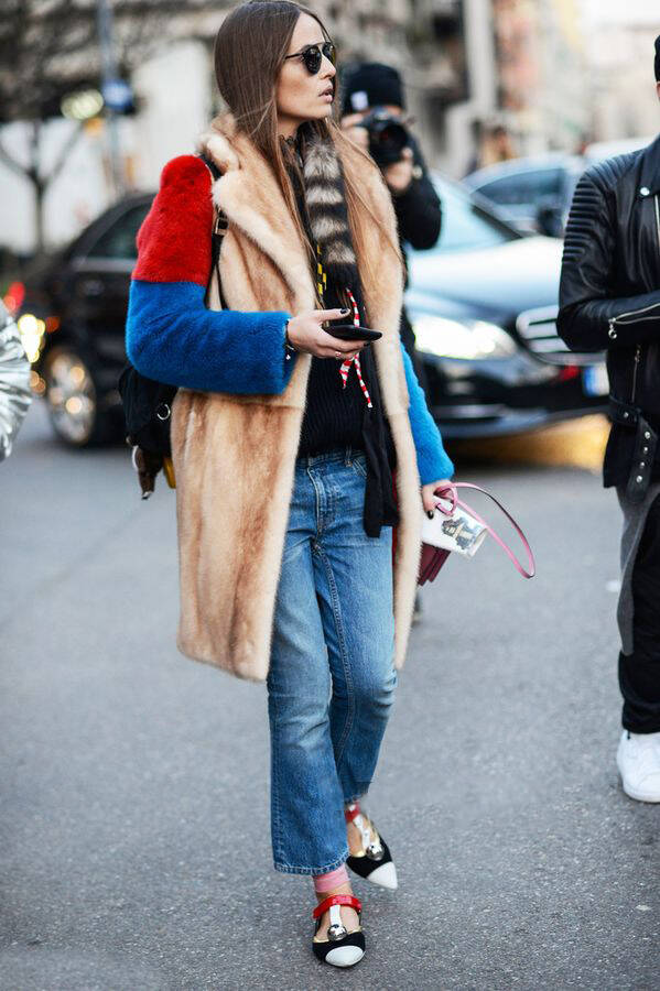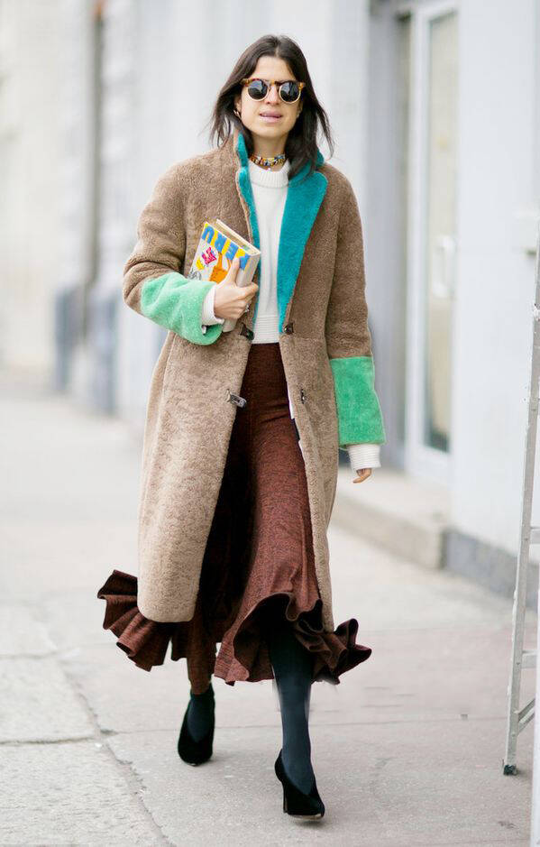 Leandra Medine身穿拼色皮草外套,搭配荷叶边半裙,造型时髦又十分抢镜。