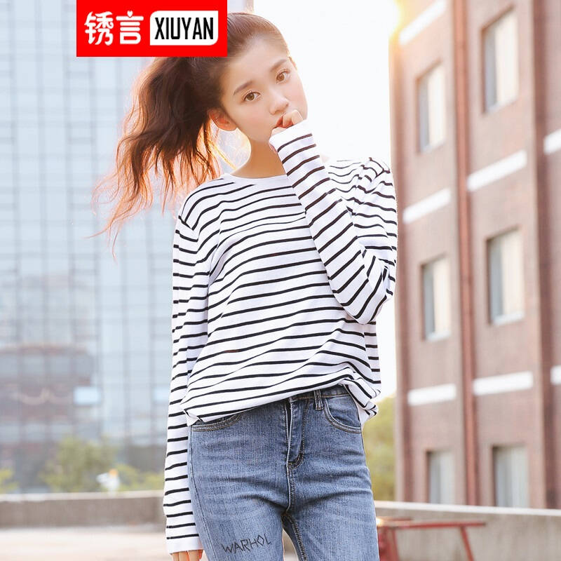锈言2016秋季长袖针织衫女新品学生装针织衫打底衫女毛衣圆领初中高中生条纹长袖套头针织衫女 黑白色 均码