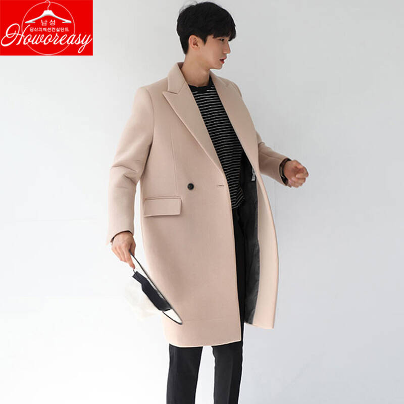 Howoreasy 2016冬季毛呢大衣男中长款外套 呢子大衣男士韩版风衣男 米白色 XXL