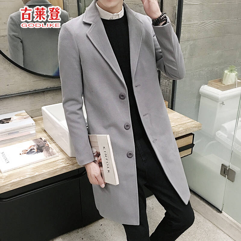 古莱登风衣男2017春季中长款韩版修身男神呢子大衣学院风青年学生披风时尚休闲外套 灰色 XL(125-140斤)