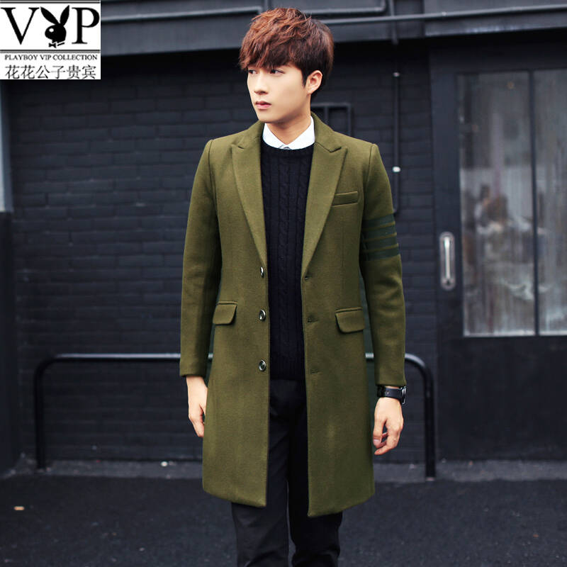 花花公子贵宾毛呢大衣男中长款2016新款风衣男韩版修身时尚外套 军绿色/ XL
