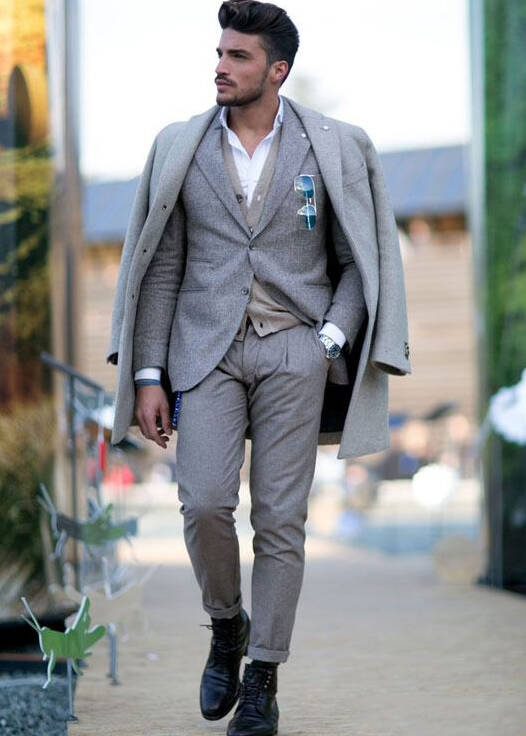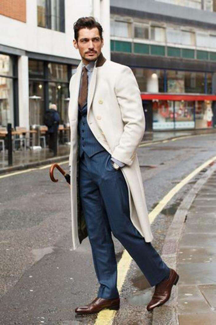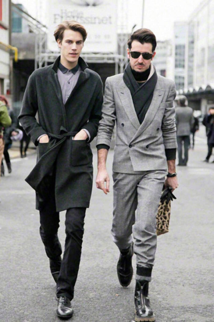 同样是西服套装搭配呢大衣的穿搭,但是在颜色的选择上更加跳跃,白色外套十分显眼。鞋子、领带和撞色翻领相呼应,注重细节的协调。
