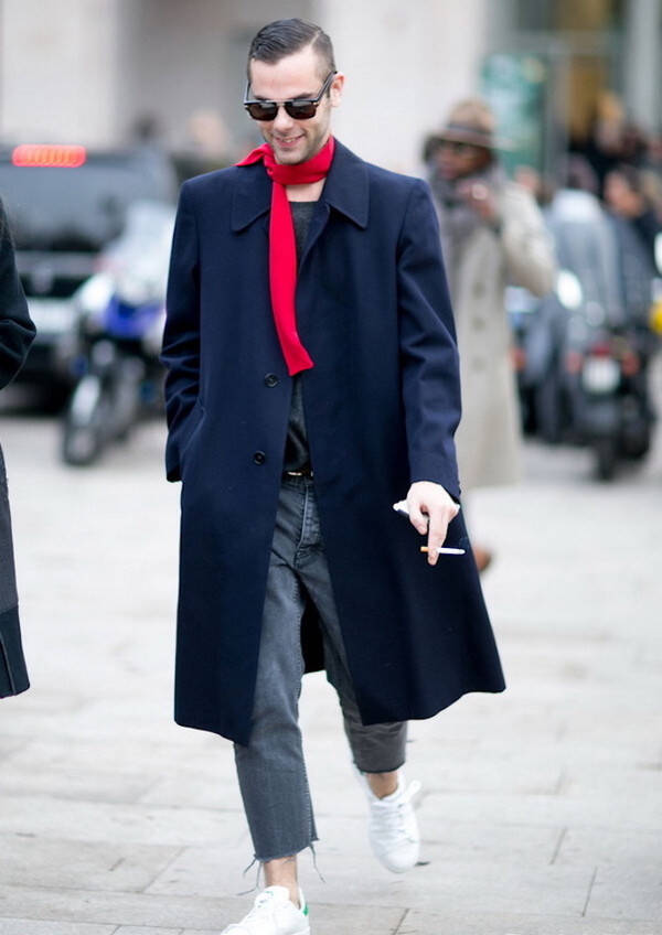 藏青色单排扣大衣,简单的基本款,毛边设计的牛仔九分裤增加时尚度,红色围巾一上身就改变了原本低调的氛围。