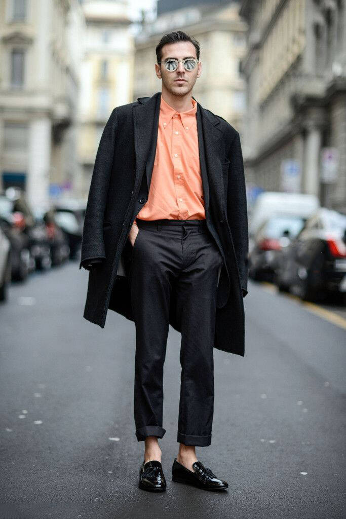 万能的黑色款大衣,搭配黑色西装套装,脚踩经典的英伦风乐福鞋,以一件橙色衬衫点亮整个造型,带来早春的气息。