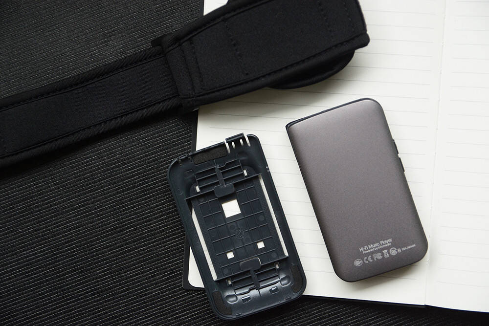 整个播放器尺寸适合,一手掌握刚刚好,圆弧处理加上金属冲压氧化面板,灰黑的配色显得十分低调又有内涵,结合臂带使用是运动风,单独使用时一股商务风却扑面而来。
