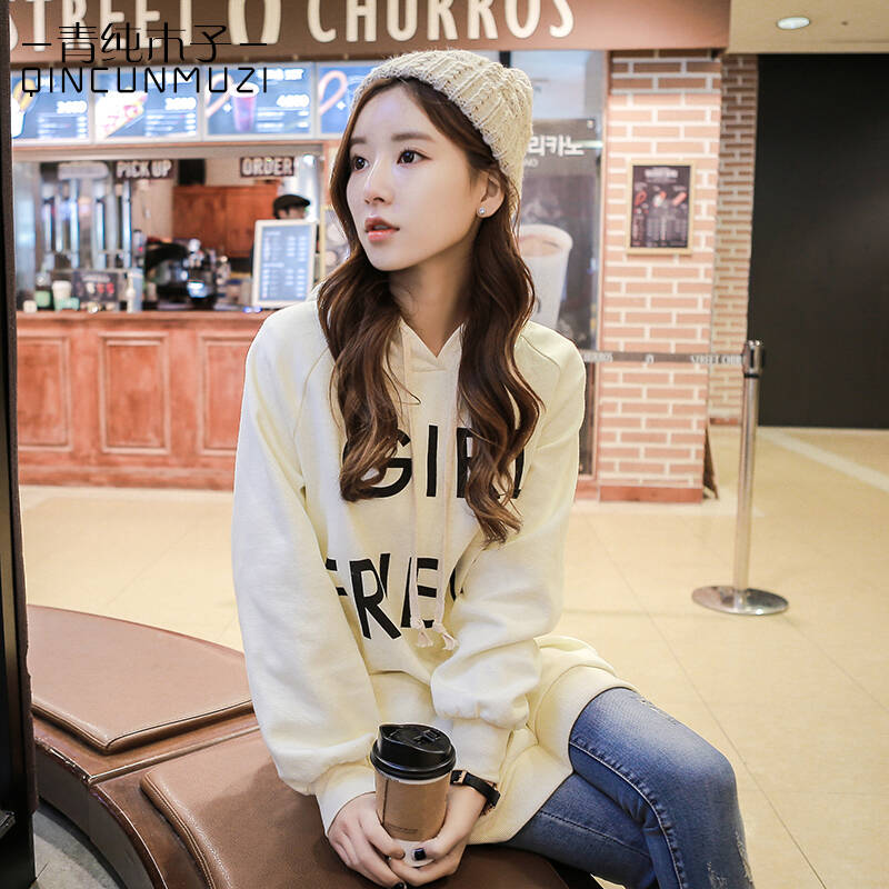 青纯木子2017新款春季韩版套头宽松卫衣女春秋装大码长袖中长款休闲运动外套连帽上衣 米白色(连帽) 均码
