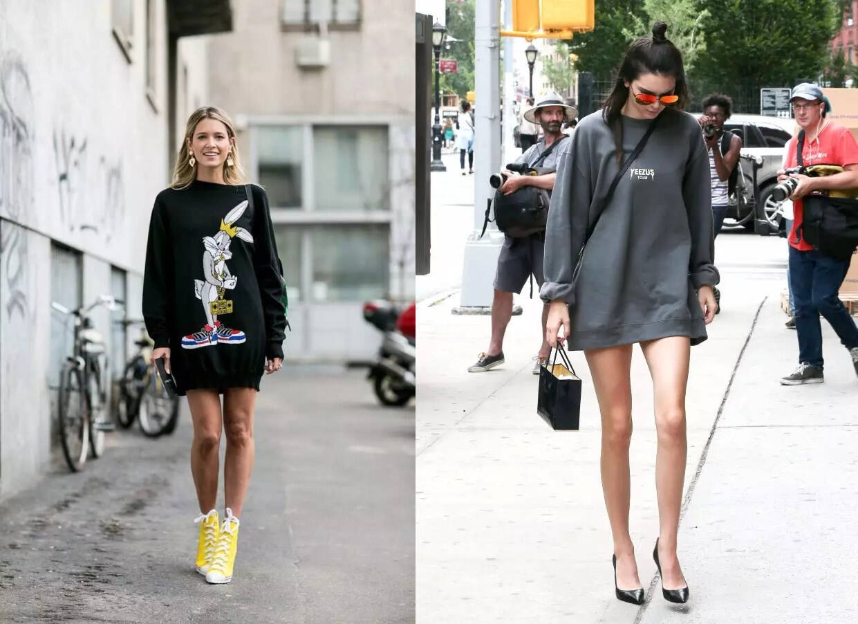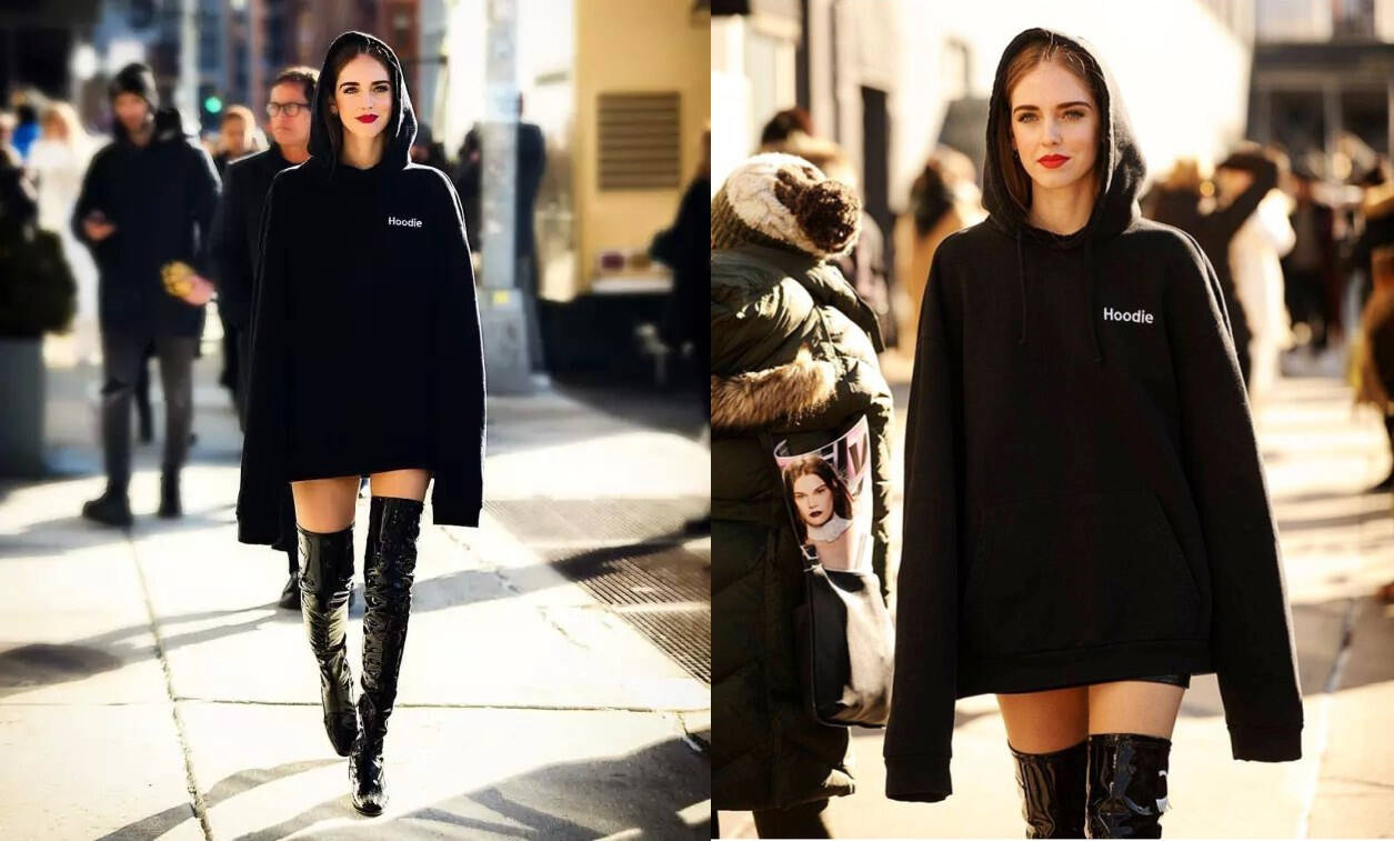 宽大、中长款的卫衣,可以单穿。只要在里面搭配一件看不出来的短裤,长腿效果立显。像Chiara Ferragni这样宽大的卫衣搭配长靴,就非常的个性又与众不同。