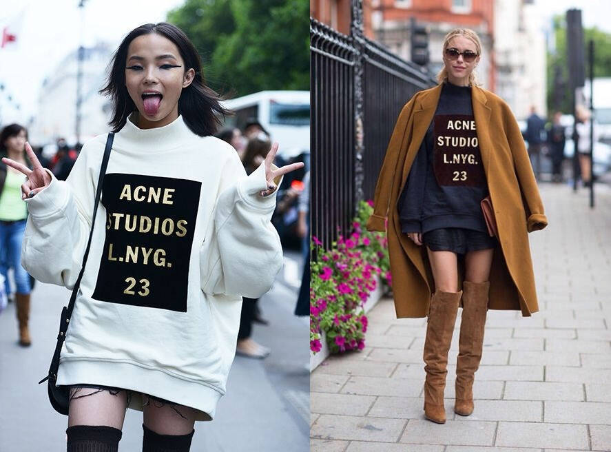 ACNE STUDIOS这件卫衣分别被她们穿出了不同的味道。一个单穿搭配黑色长靴,是少女的青春气息。一个搭配驼色大衣和驼色长靴,穿出了欧美大牌时髦范儿。