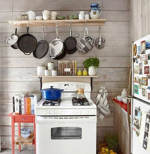 厨房的空间不大,那就千万不要忽视了墙壁的空间,只要在墙壁上安装一个搁板置物架,上方就可以摆放锅具和碗碟,还可在搁板上挂上几个挂钩,这样可以收纳更多的锅具,而且挂起来要找寻也是一目了然,拿取都方便。一下子就为厨房创造出一个巨大的收纳空间,很实用有木有?