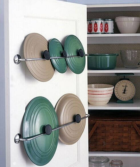 厨房里既然有这么多做美食的锅具,当然我们就不能掉锅盖的收纳问题。下过厨的都知道,在厨房煮菜的时候,一把锅盖拿起来就没地方放了?一放在台面上,就占去了大半个操作台,这真的是太浪费空间了。在厨房准备一个锅盖架是一个非常实用的小技巧,也可以利用橱柜门的后背空间,安装置物架,可以很好的将锅盖隐蔽收纳起来。