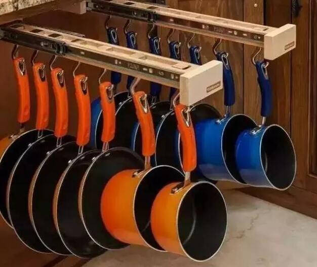 除了墙壁的空间能收纳,还可以考虑在橱柜里安一个可抽拉的悬挂式挂杆,带上几个挂钩,就能将大大小小的锅具整齐的挂放在橱柜内部,拿取方便,收纳整齐,这样立显厨房整洁宽敞不少。