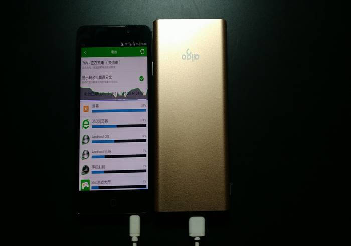 电源输入采用5V电压1.5A/2A电流。移动电源出厂时,大概60%左右的电量。笔者从这个电量充到100%用了两个小时,速度还算可以。移动电源只有一个USB输出口,可以为设备提供5V/2.1A的电流输出。测试给酷派大神F1充电,手机剩余电量30%,N1电量100%。一个小时后,手机充到76%,移动电源还剩89%。