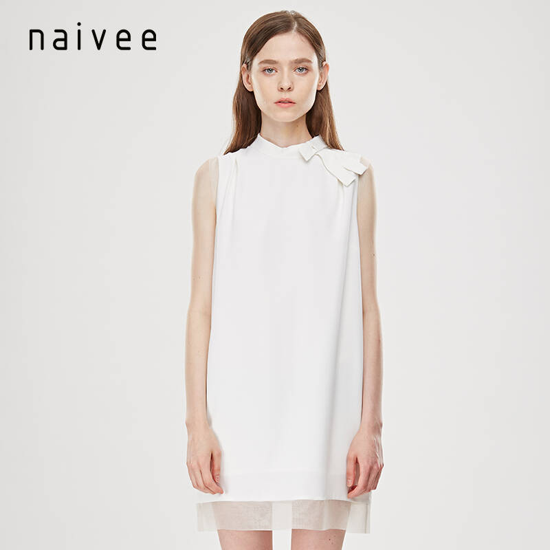 Naivee/纳薇2016冬新品蝴蝶结无袖礼服连衣裙立领宽松中裙167167580 21纯白 40/XL/170