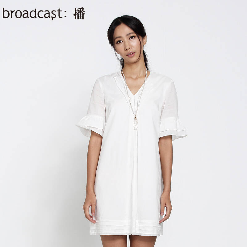 播 风在你左右 夏装新品女装时尚V领气质百搭荷叶袖纯色中长款连衣裙女 W20奶白色 M
