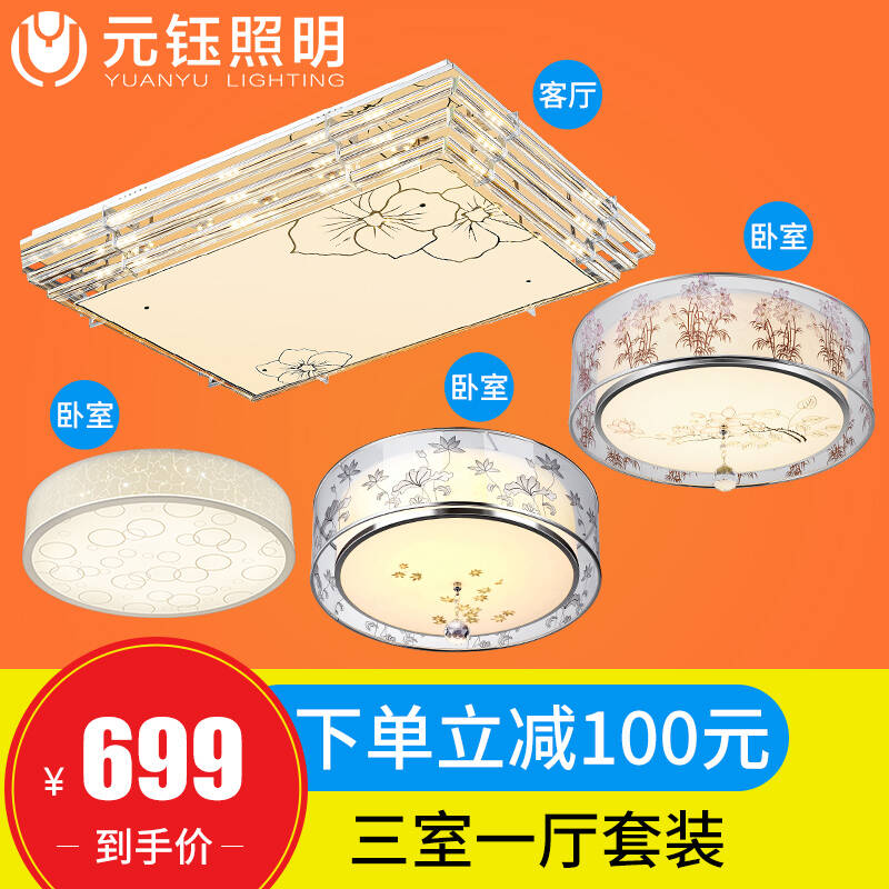 元钰LED灯吸顶灯客厅 长方形水晶灯具现代简约卧室创意灯饰套餐组合成套灯具套餐 三室一厅(客厅三色64瓦)包含赠品4个灯套餐A