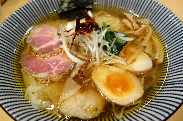 这是盐味拉面的名店。这间店将拉面称为「荞麦面(soba)」。使用高级材料来熬制汤头,并且加到汤头当中的盐味酱料,特别使用店家精心调和国内外6种盐巴的特调盐。最基本的「盐味Soba(1,000 JPY(含税))」就非常好吃,但含有半熟蛋、叉烧和馄饨的「特制盐味Soba(1,250 JPY(含税))」更是推荐不可错过的美味。每周五会改成以「酱油鸭肉Soba」专门店「紫Kuro喜」之姿登场,因此前往前请注意一下日期喔。