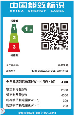 官方的答案是:能效比是能源转化效率之比,貌似太专业了,各位客官记住:能效比越大的,就越节能就对了,大家可以通过页面参数或者能效标签找到能效比: