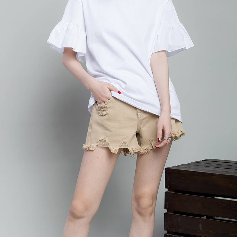 ICY毛边磨破牛仔短裤2017春季新款女装潮 高腰修身短裤 卡其色 S