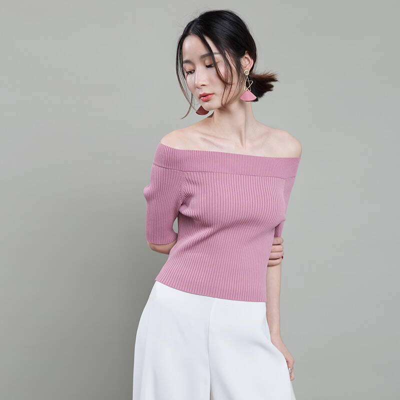 icy一字领露肩上衣2017春季新款女装潮修身纯色针织衫 粉色 M