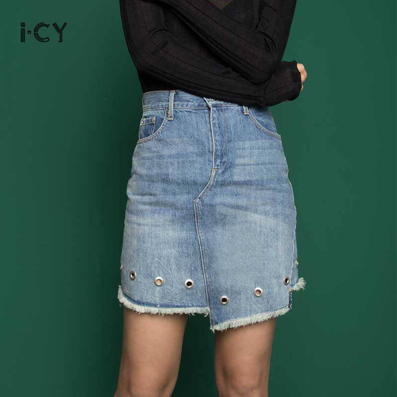 ICY牛仔短裙2017春季新款女装潮 简约中腰不规则流苏半身裙 牛仔蓝 26