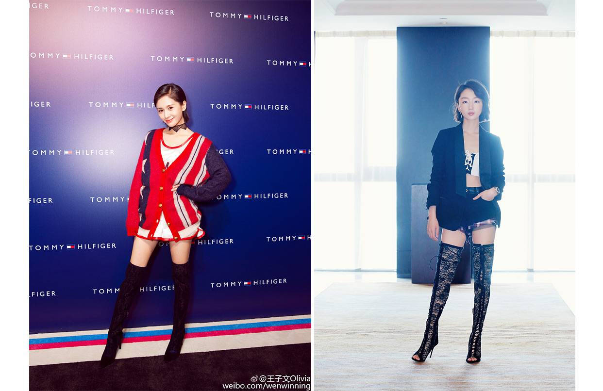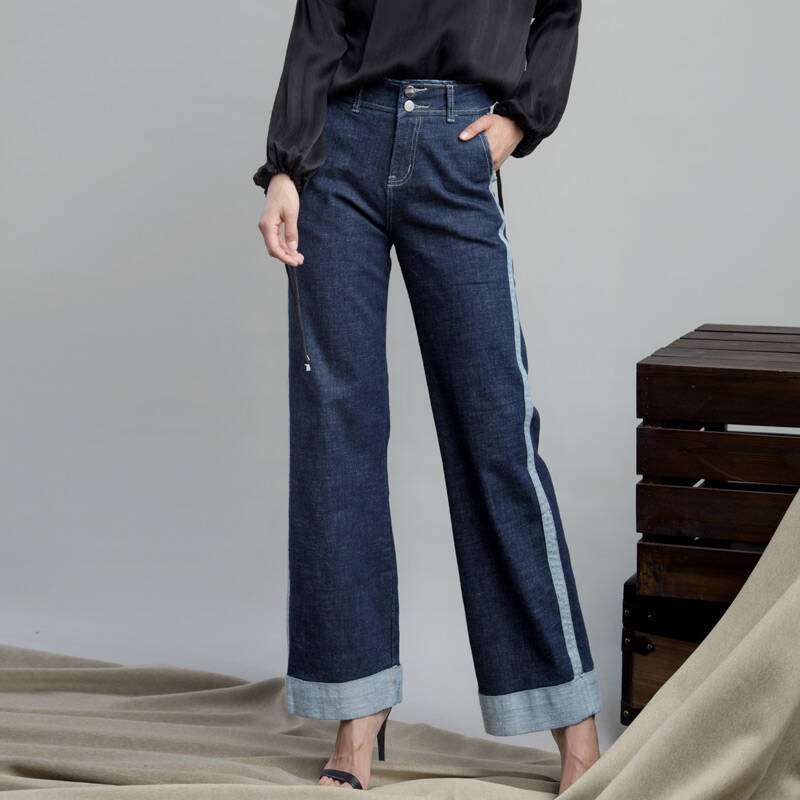 ICY双色拼接单宁阔腿裤2017春季新款女装潮 修身高腰撞色长裤 牛仔蓝 27