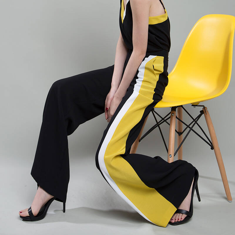icy雪纺撞色阔腿裤2017春季新款女装潮 宽松长裤 黑色 S