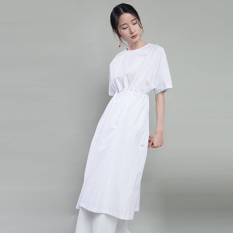 icy绑带连衣裙2017春季新款女装潮 简约纯色五分袖宽松裙 白色 S