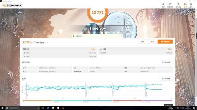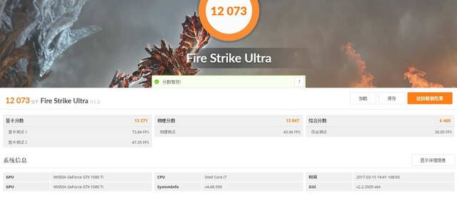 在3DMark的跑分测试中,耕升GTX1080TiFE双卡SLi后的成绩也相当亮眼。TimeSpy的图形分高达18443,是我们之前单卡测试的两倍。而4K测试FireStrikeUltra也有13271的完美表现,相信能带来相当不错的4K游戏体验。