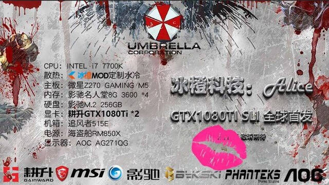 这台来自冰橙科技的水冷主机除了使用两片耕升GTX1080Ti显卡,还配备了4根影驰名人堂内存和一片影驰M.2固态硬盘。CPU和主板则是当下主流的i7-7700K+Z270,电源和机箱也是选用的一线品牌,整机配置堪称恐怖。具体配置如下: