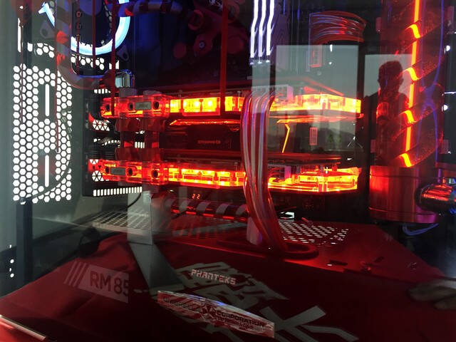 值得一提的是,这次装机使用的水冷设备是来自冰橙科技自制的MOD套件。为了配合耕升显卡一贯的红色风格,水冷散热器还穿上了红色马甲,使得主机整体更显时尚动感。