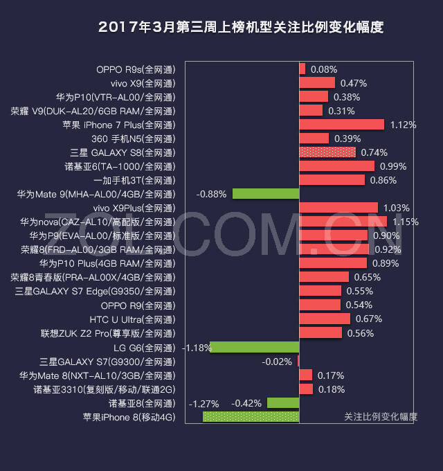 ·华为nova(CAZ-AL10/高配版/全网通)上涨1.15%,领涨;苹果iPhone8人气回落