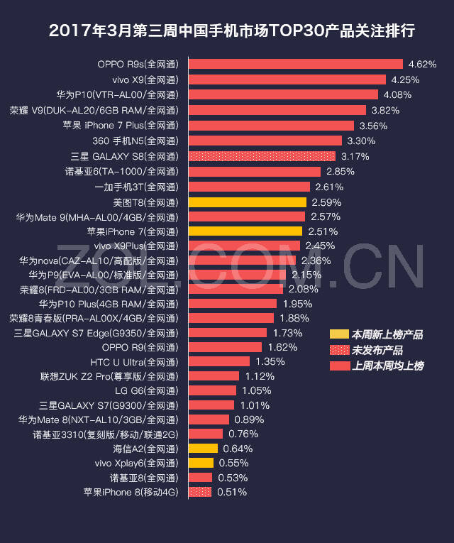从最受用户关注的TOP30产品来看,OPPOR9s(全网通)、vivoX9(全网通)、华为P10(VTR-AL00/全网通)前三甲的地位稳固,关注比例均在4%以上。