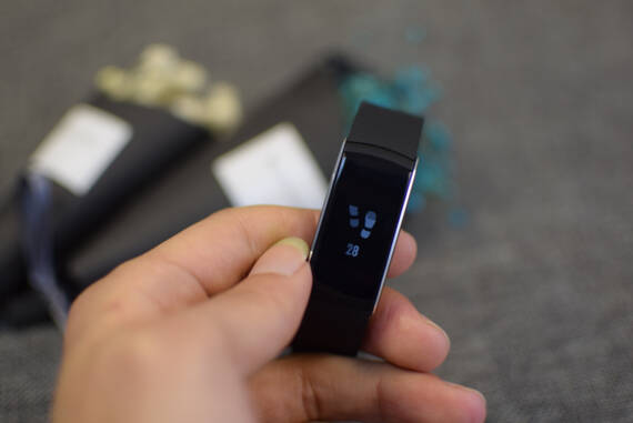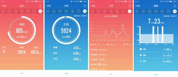 横向滑动屏幕或者点击滑动屏幕便可一一查看:时间、步数、卡路里、距离以及心率。除此之外,还支持日程管理、信息推送(可本地存储8条信息)、来电提醒和拒接电话,而且具有智拍功能。所以该智能手环还是挺实用的。