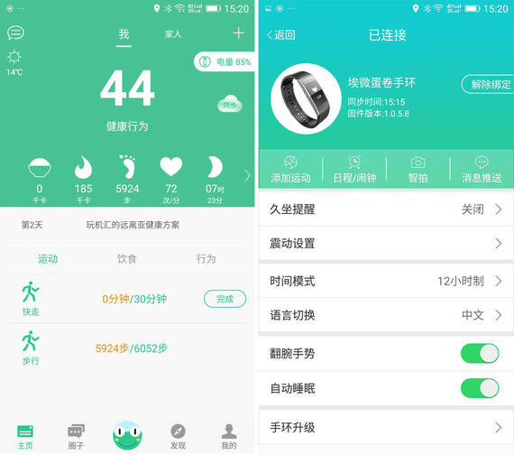 下载了埃微健康助手后,埃微蛋卷手环通过蓝牙与手机直接连接,在其中输入你的身高体重,设置并同步后,进入界面,而且各个功能也能一目了然。 主界面上半部分为我们提供了健康行为数据,通过同步后,可以很详细的查看你走的步数和所消耗的能量。而下半部分则是快走和步行步数计划,以及饮食方案和行为计划。另外,可以通过APP来配置手环翻腕手势功能,也就是我们俗称的翻腕亮屏。除此之外,设置久坐提醒功能,对于经常坐办公室的人来说是个不错的设计。当然,也涵盖了市面上大多数智能手环的几乎所有功能,使用起来还是非常的便捷。