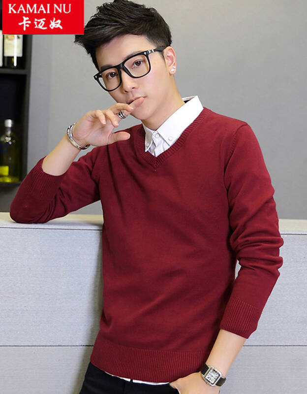 卡迈奴 毛衣男 2017春新款男士针织衫V领毛衣韩版修身加厚毛线衣 酒红色 XL