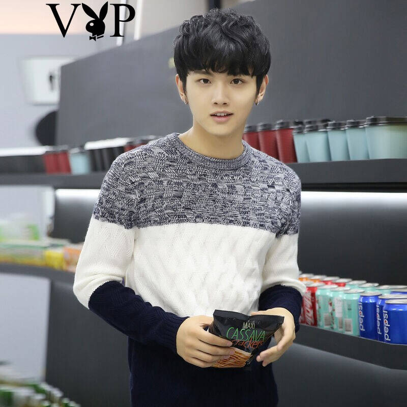 花花公子贵宾2017春季新款毛衣男士韩版拼色粗针织毛衣打底针织衫男装A2603 黑色 175/XL