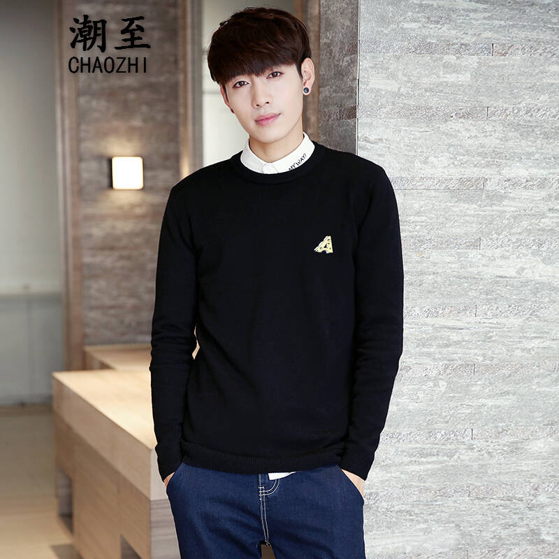 潮至 毛衣 男 圆领套头衫 时尚修身青年男士针织衫秋冬新款休闲套头毛线衣男打底衫 黑色 M