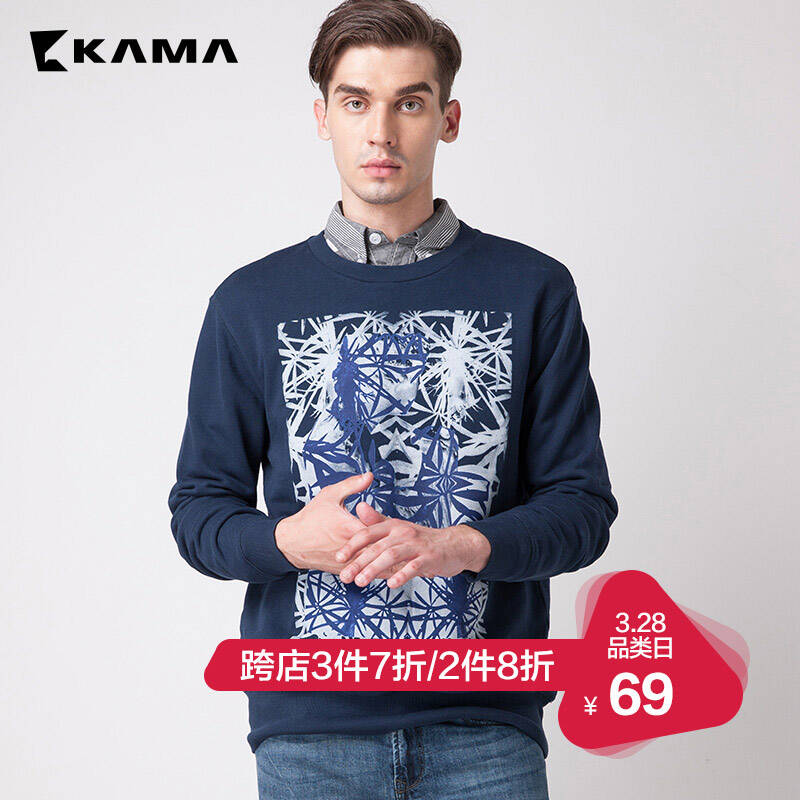 卡玛KAMA 卫衣男 春季套头印花潮人卫衣男士长袖圆领卫衣2316614 蓝色 S