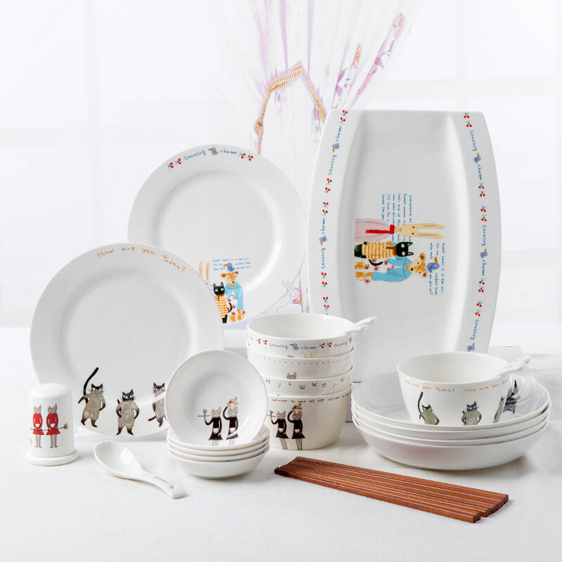 亿嘉IJARL 时尚陶瓷韩式碗碟套装28头餐具套装 猫国物语