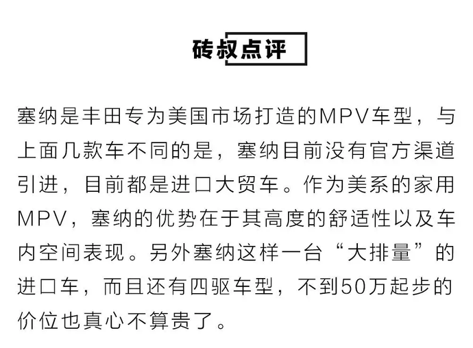“保姆车”一词源于香港明星们的座驾,最标准的座驾就是一台丰田埃尔法。低调、高级又宽敞舒适,是这类豪华型MPV的标准气质,这也给予了它家商多用的能力。然而在国内,一台埃尔法不仅价格昂贵,而且还得加价购买,所以倒不如选择这几款同级车型。