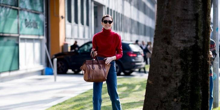 牛仔阔腿裤+高领衫 牛仔阔腿裤的挺括造型十分修饰腿部线条,想走利落范不妨搭配简洁的高领衫,将其扎于腰间,拗出两米长腿不是梦!