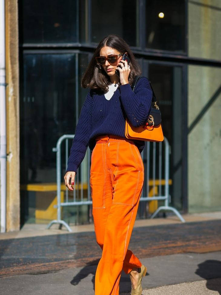 阔腿裤+针织上衣 阔腿裤略微挺括的质感搭配柔软的针织衫上衣,将舒适休闲的韵味一并带出。而醒目撞色搭配散发出你的活泼气息。
